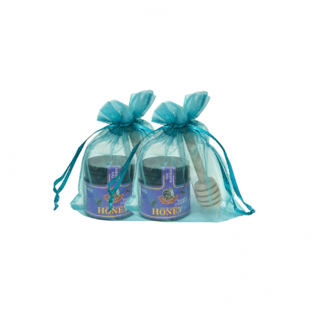 Description: A pair of 42g Superbee Australian premium honey bottles in coloured organza bags with mini bamboo dippers (8cm long) dipper.