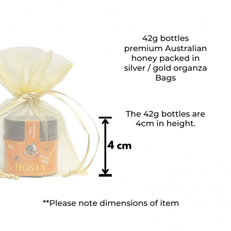 Description: A pair of 42g Superbee Australian premium honey bottles in coloured organza bags with mini bamboo dippers (8cm long) dipper.